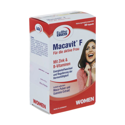 مکمل تقویتی کپسول ماکاویت اف یوروویتال 60 عددی تقویت میل جنسی و افزایش تحریکپذیری، کاهش خستگی، افزایش انرژی، حاوی ویتامینهای گروه B، زینک، سلنیوم، عصاره گیاه ماکا و گوارانا برای سلامت زنان