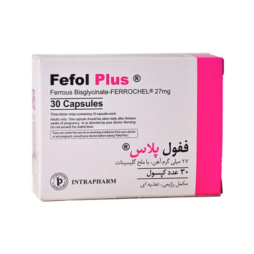 مکمل آهن کپسول ففول پلاس اینترافارم 27 میلیگرم با ملح گلیسینات بسته 30 عددی