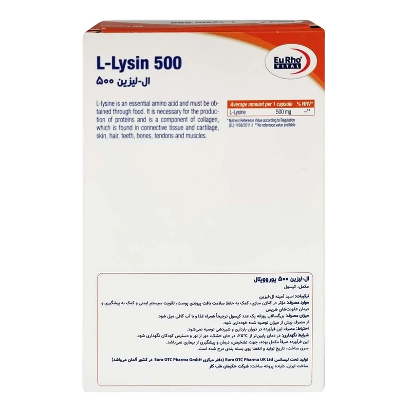 کپسول ال لیزین 500 میلیگرم یوروویتال بسته 30 عددی تقویت سیستم ایمنی، کمک به پیشگیری و درمان عفونتهای هرپس، موثر در کلاژنسازی و حفظ سلامت بافت پیوندی پوست