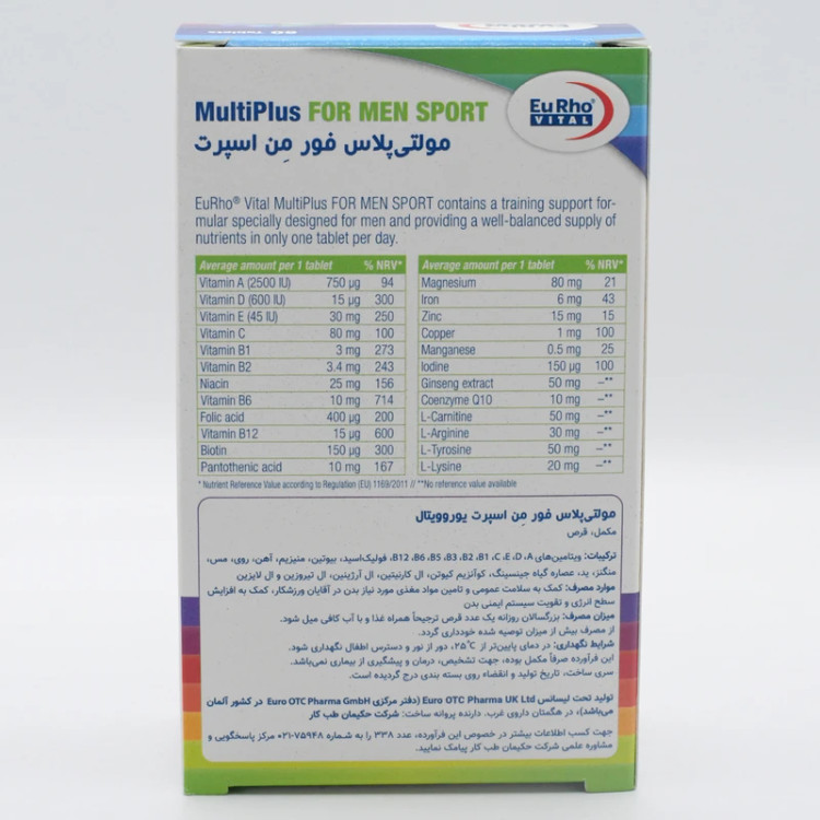 قرص مولتی ویتامین مینرال ورزشی 60 عددی یوروویتال مدل مولتی پلاس فور من اسپرت با آنتیاکسیدان جینسینگ و کوآنزیم کیوتن، آمینو اسیدهای ال-آرژینین، ال-تیروزین، ال-کارنیتین، افزایش انرژی، بهبود عملکرد ورزشی و تحریک عضلهسازی