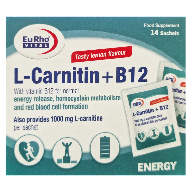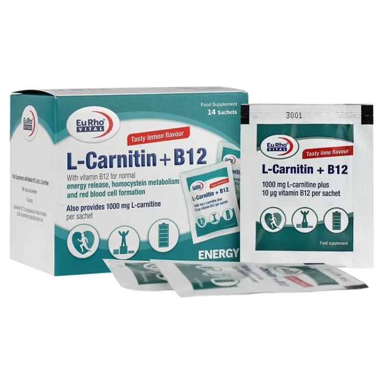 پودر ال کارنیتین پلاس B12 یوروویتال 1000 میلیگرم ال کارنیتین کمک به بهبود متابولیسم چربیها، افزایش انرژی، کاهش خستگی و حمایت از سلامت قلب و عروق بسته 14 عددی